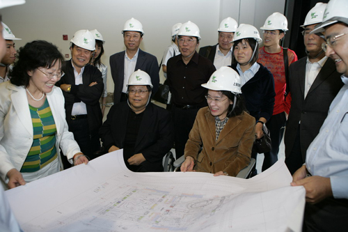 圖為中國殘聯(lián)主席張海迪一行視察世博會生命陽光館時觀看設(shè)計圖紙