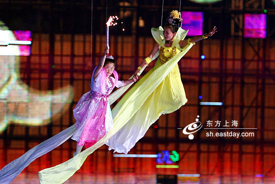 當(dāng)全場沉浸在薩克斯演奏家肯尼·基《梁?!窐非校⒈慌_上演員服裝在黑暗中發(fā)出的點點熒光所吸引時,眼尖的觀眾忽然發(fā)現(xiàn)天空中正有“七仙女”緩緩飄來,隨著涼風(fēng)的吹拂,裙袂翻飛,衣帶飄飄,頗有一股仙氣。一直渴望飛上星空的智障女孩高清瑜也和所有人一樣在抬頭仰望,黃衣“仙女”從天而降,真的帶領(lǐng)她一起飛向遠方……高清瑜拿著焰火棒,一邊微笑著向下面揮手,一邊漸漸遠離眾人的視線。觀眾們對這位可愛的小天使報以熱烈的掌聲,為她的勇敢,也為她甜蜜的笑容。