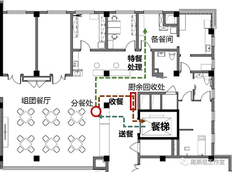 圖8 A設(shè)施餐梯及組團餐廳之間加設(shè)了備餐臺及餐車停放處,便于備餐分餐操作