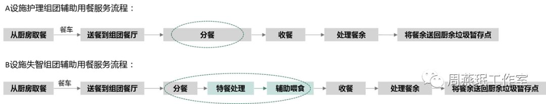 A、B兩個設(shè)施組團的輔助用餐服務(wù)內(nèi)容和流程相似,但兩者配置了不同的輔助服務(wù)空間,調(diào)研時也發(fā)現(xiàn)了不同的使用問題: