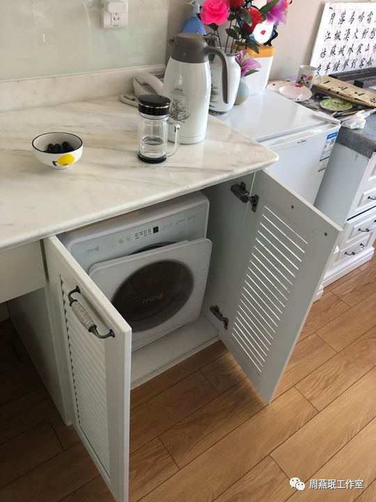 A設(shè)施護理組團的洗衣模式是“集中洗衣房洗衣”,其洗衣流程如圖12所示,組團內(nèi)未布置單獨的洗衣空間,但在清潔間內(nèi)布置了臟衣物暫存處(圖11),較好地承擔(dān)了“中轉(zhuǎn)”功能。此外,不少老年人還自購了小型洗衣機及晾曬架放在居室(圖13),據(jù)入住老人反映,“集體洗衣”在時間上不夠靈活,因而在居室自購了洗衣機用于及時處理貼身衣物。