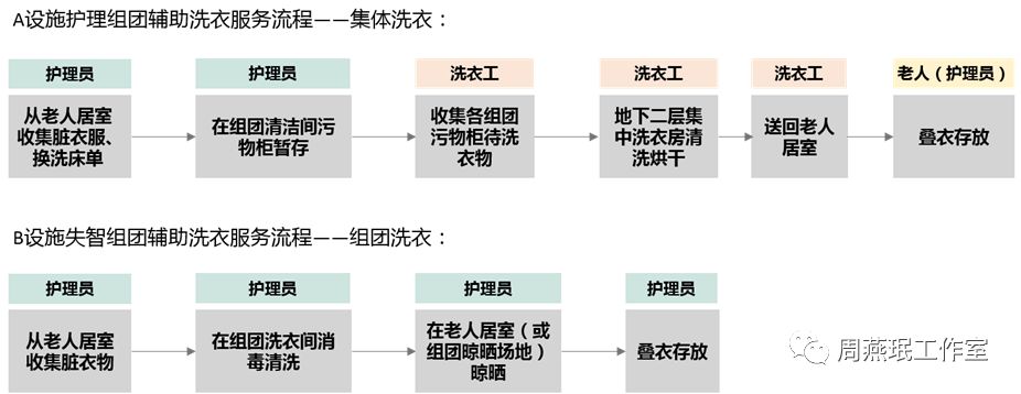 通過對上述輔助洗衣工作的觀察分析,可以發(fā)現(xiàn):A設(shè)施組團未配置組團洗衣間,B設(shè)施組團配置了組團洗衣間,但兩者的洗衣工作目前都得到較好的支持,這是因為兩者的運營模式不同。A設(shè)施組團的老年人在洗衣方面大多可以自理,更希望在居室設(shè)洗衣機,以滿足日常不定期的清洗需求,而大型物件則需要集中處理,因此采用“集中洗衣+居室洗衣”的模式。而B設(shè)施組團的認知癥老人較多,洗衣更需要護理人員幫助,清洗的頻率較高,需求更急迫,且有較高的消毒要求,因而相比在居室或集中洗衣房洗衣,“組團洗衣”模式更合適。