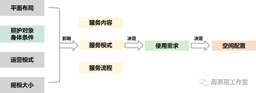 綜上所述,護理組團輔助服務(wù)空間的配置要求并不是一成不變的,配置與否及如何配置與眾多因素相關(guān),而其中最核心的因素則是照護對象的身體條件。照護對象的身體條件,直接影響其所需的服務(wù)內(nèi)容、模式及流程,進而影響使用需求,而使用需求決定了空間配置要求(圖14)。例如上述B設(shè)施組團有很多臥床老人需臥姿洗浴,因此在提供助浴服務(wù)時需借助浴床或相應(yīng)設(shè)備,及足夠的輔助操作空間,這些使用需求決定了配置公共浴室的必要性。