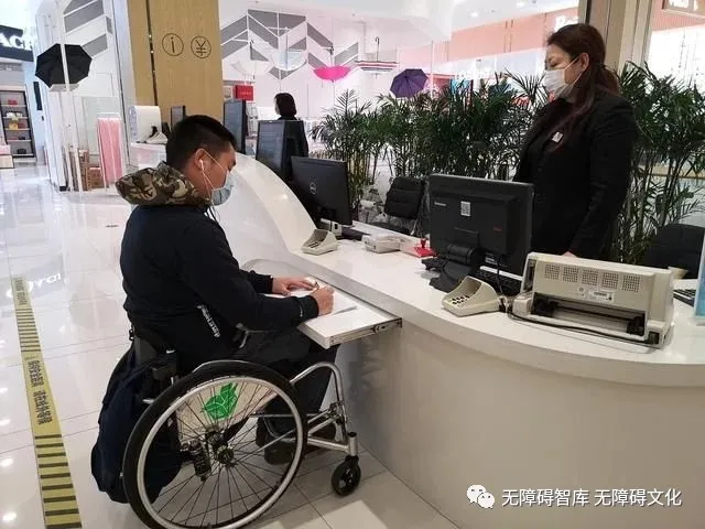 體驗(yàn)完無障礙停車位,我們正式進(jìn)入到長安商場的內(nèi)部區(qū)域,首先來到一層服務(wù)臺(tái),服務(wù)臺(tái)設(shè)有高低服務(wù)臺(tái)兩個(gè)不同區(qū)域,為方便輪椅者使用,低位服務(wù)臺(tái)還單獨(dú)設(shè)置了可伸縮的寫字板,并且寫字板下面預(yù)留出足夠的容膝空間,符合國標(biāo)要求的寬750毫米,高650毫米,深450毫米,同時(shí)回轉(zhuǎn)空間不小于1.5米的低位服務(wù)設(shè)施的相關(guān)要求。以往輪椅使用者簽字,刷卡一類的動(dòng)作沒有足夠的容膝空間都會(huì)讓輪椅使用者很吃力,這一細(xì)致貼心的設(shè)計(jì)非常人性化,讓輪椅使用者有很好的體驗(yàn)感受,很貼心。