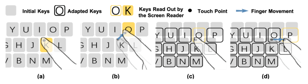 目前,視障人士可以通過(guò)讀屏軟件使用手機(jī)。但在文本輸入時(shí),經(jīng)常因?yàn)辄c(diǎn)擊不準(zhǔn)影響輸入效率,增大了交互難度。針對(duì)該問(wèn)題,清華大學(xué)計(jì)算機(jī)系教授史元春和副研究員喻純帶領(lǐng)團(tuán)隊(duì)創(chuàng)新性提出字符級(jí)文本輸入糾錯(cuò)方法,基于盲人用戶輸入行為模型和語(yǔ)言模型動(dòng)態(tài)預(yù)測(cè)目標(biāo)字符,在手指碰觸瞬間自動(dòng)調(diào)整鍵盤布局,實(shí)現(xiàn)字符級(jí)自動(dòng)糾錯(cuò)。使用該方法,用戶在零學(xué)習(xí)成本的情況下,可節(jié)省63%的糾錯(cuò)操作。字符級(jí)糾錯(cuò)算法運(yùn)算效率高,響應(yīng)速度在毫秒級(jí),支持任意語(yǔ)言的文本輸入。團(tuán)隊(duì)的相關(guān)工作發(fā)表在人機(jī)交互領(lǐng)域頂級(jí)學(xué)術(shù)會(huì)議——國(guó)際計(jì)算機(jī)學(xué)會(huì)人機(jī)交互大會(huì)(The ACM CHI Conference onHuman Factors in Computing Systems 2019)上,并獲得榮譽(yù)論文獎(jiǎng)。