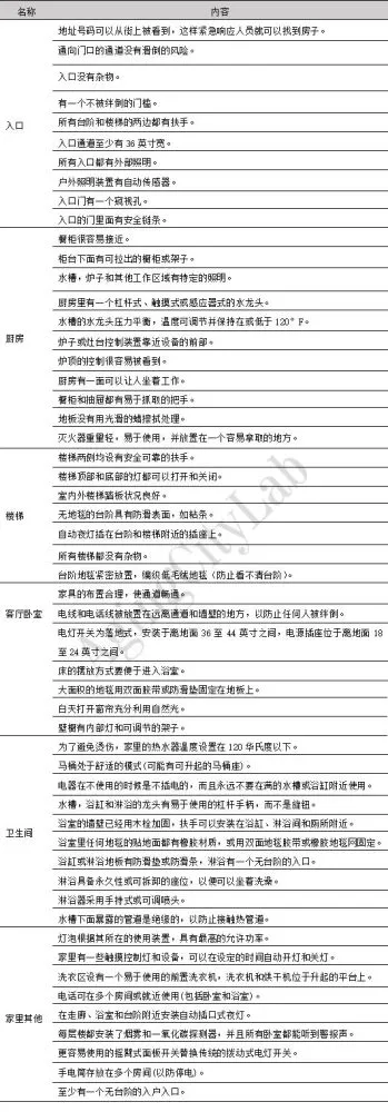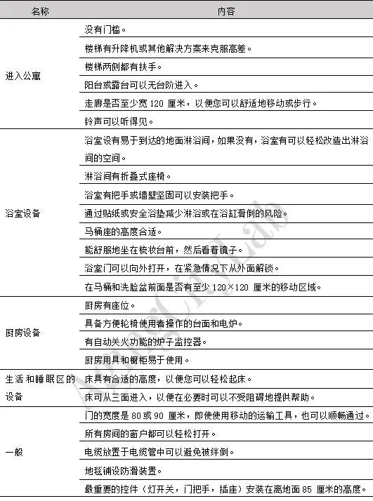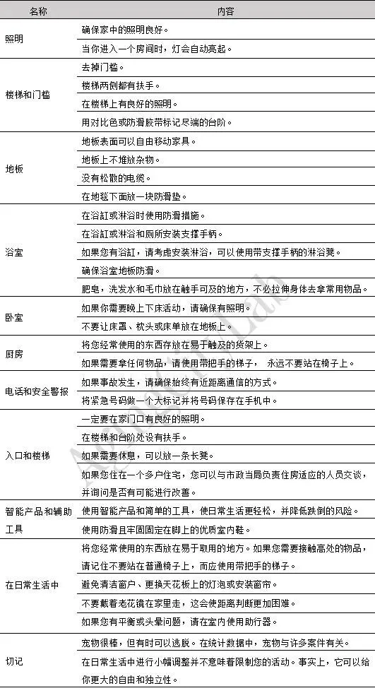 資料來源:根據(jù)AARP(2015)整理繪制住房方面,在具體改造內(nèi)容上,歐美各國一般從空間設(shè)計(jì)和設(shè)施適老兩方面入手,主要聚焦在保障老年人安全、健康、便利、舒適生活的空間和設(shè)施改造。由于在廚房和衛(wèi)生間內(nèi)對(duì)老年人產(chǎn)生安全隱患的設(shè)施最多,因此他們成為各國改造清單中最受重視的空間。此外,瑞典對(duì)預(yù)防跌倒措施的闡述詳盡,美國對(duì)其他輔助設(shè)計(jì)例如安裝煙霧探測(cè)器等也有提及。在適老改造項(xiàng)目分類上,發(fā)達(dá)國家和地區(qū)的分類標(biāo)準(zhǔn)為居民戶內(nèi)日?;顒?dòng)空間類型,將住房改造要素按照衛(wèi)生間、廚房、臥室、門廳等歸類。也有技術(shù)體系為了對(duì)各空間通用的重要設(shè)施進(jìn)行強(qiáng)調(diào),單獨(dú)將其分出,例如安全警報(bào)、智能產(chǎn)品、其他設(shè)施等。在適老化改造清單的拓展性上,部分國家在基礎(chǔ)改造清單之外會(huì)形成補(bǔ)充建議清單。例如美國AARP的HomeFit Guide指南在后半部分給出了適老部件購物清單、個(gè)人改造清單、專業(yè)人員改造清單、注意事項(xiàng)、職業(yè)治療師或認(rèn)證老年專家介紹、節(jié)能方法等,輔助老年人可以在有條件情況下進(jìn)行自行改造和提供相關(guān)資訊。在適老改造內(nèi)容的可讀性上,各國基本會(huì)借助圖示對(duì)改造項(xiàng)目進(jìn)行說明,增強(qiáng)指南可讀性。美國會(huì)首先借助問卷的形式對(duì)目前住房的適老程度進(jìn)行調(diào)查,幫助居民更好地理解改造清單所選項(xiàng)目的必要性。服務(wù)設(shè)施方面,各國聚焦在老年服務(wù)和老年服務(wù)設(shè)施兩方面,討論的內(nèi)容基本圍繞醫(yī)療護(hù)理、日常家政、文體志愿等幾個(gè)方面,對(duì)保障老年人基本健康的醫(yī)療服務(wù)最重視。