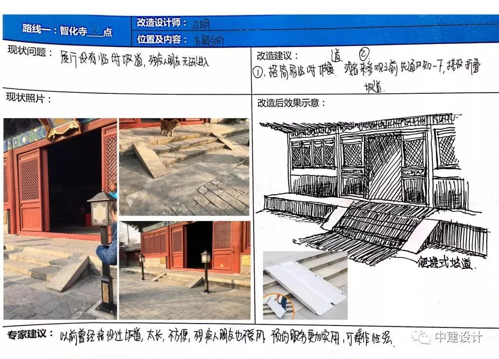 北京胡同和歷史保護(hù)建筑的無(wú)障礙改造一直是無(wú)障礙工作的難點(diǎn),本次活動(dòng)以中建設(shè)計(jì)集團(tuán)無(wú)障礙研究成果為依托,組織來(lái)自建筑、景觀、環(huán)藝等專業(yè)的20名黨員建筑師,針對(duì)北京市東城區(qū)祿米倉(cāng)胡同、智化寺及周邊區(qū)域開(kāi)展無(wú)障礙專題調(diào)研和專項(xiàng)設(shè)計(jì)。
