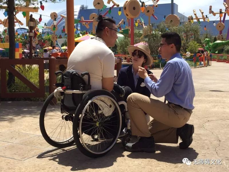 緊接著,迪士尼的一天體驗是震撼比較大的。迪士尼給我的第一感覺就是一個主題游樂園,興起于美國,香港后來有一個,是發(fā)達國家的代表做。這次無障礙的體驗選擇迪士尼只不過是因為它在無障礙方面做的先進,做得好。體驗一天之后才覺得不是做得好,是太好了。開始只不過是以為衛(wèi)生間好,道路好,坡道好,對于游戲項目也無非就是一些簡單安全的可以體驗,至于驚險刺激的就別考慮了。然而進去體驗才知道,從衛(wèi)生間到道路,從井蓋到樹坑,低位的水龍頭,所有設計都非常人性化也特別通用。所有娛樂項目,都設有殘障人專席,連轉(zhuǎn)移需要的一些配套輔助設施都一應俱全。