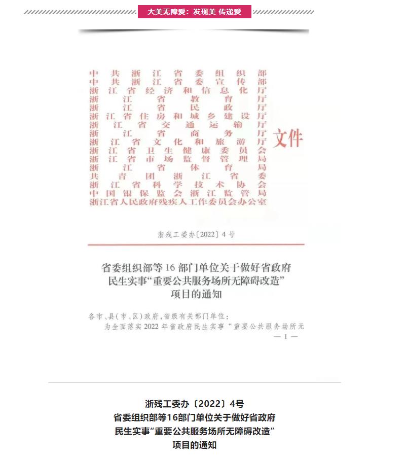 為全面落實(shí)2022年省政府民生實(shí)事“重要公共服務(wù)場所無障礙改造100。個(gè)”項(xiàng)目,提高我省各類重要公共服務(wù)場所無障礙 環(huán)境建設(shè)水平,迎接杭州2022年第19屆亞運(yùn)會(huì)和第4屆亞殘運(yùn)會(huì),根據(jù)《無障礙環(huán)境建設(shè)條例》《浙江省實(shí)施〈無障礙環(huán)境建設(shè)條 例〉辦法》要求和《浙江省殘疾人事業(yè)發(fā)展“十四五”規(guī)劃》《浙江省人民政府辦公廳關(guān)于印發(fā)2022年省政府十方面民生實(shí)事分解 任務(wù)的通知》等文件精神,現(xiàn)將有關(guān)工作要求通知如下:
