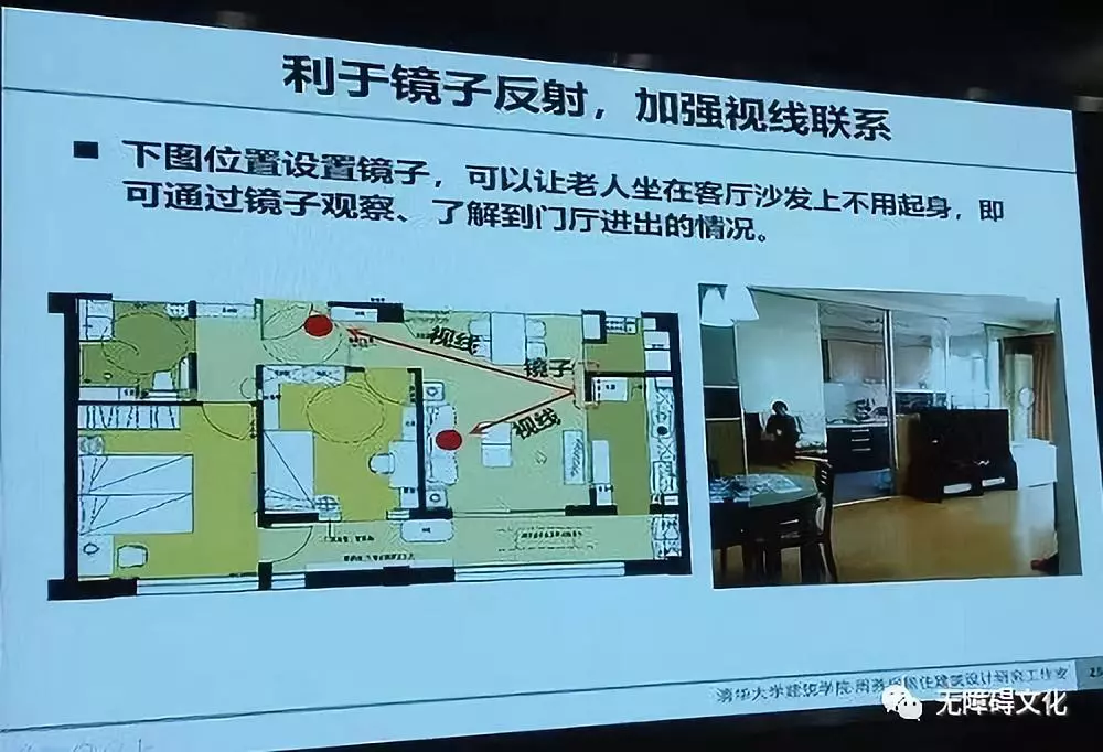 這是周教授為父母家設(shè)計(jì)的實(shí)例,巧妙地在客廳沙發(fā)對(duì)面的墻上安裝了一面鏡子,可以反射家門進(jìn)出的情況。每次回到家里,沖鏡子打一聲招呼,坐在客廳看電視的父母就看到了,不用起身就知道是誰回來了;出門了一樣,不用起身相送,沖鏡子跟老人打招呼“我走了!”既方便又安心。