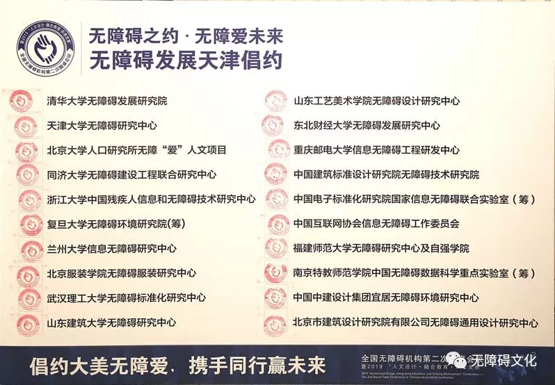 2019年3月27日,天津大學舉辦全國無障礙機構第二次圓桌會議暨2019“人文設計?融合教育?共享發(fā)展"會議,來自全國高校、科研、行業(yè)、企業(yè)和社會組織的80余家機構參加會議,會議發(fā)出“無障礙之約無障愛未來”《無障礙發(fā)展天津倡約》,與會20家機構代表在蓋章簽約,這是《無障礙發(fā)展〈北京宣言〉》的落地實施,是對建立行業(yè)無障礙專業(yè)預審、認證、監(jiān)督、驗收和處罰機制,從設計源頭上保證無障礙建設系統(tǒng)完整、高標高質建設的愿景的最好回應。