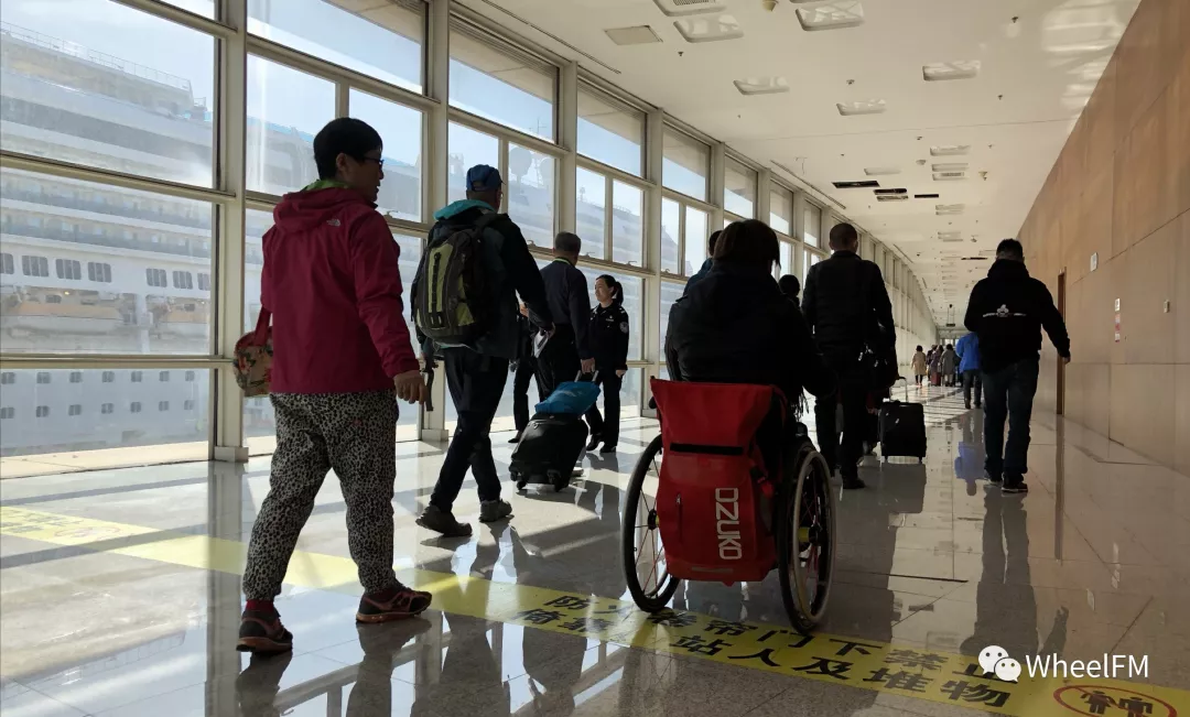 在排隊(duì)安檢的時(shí)候,突然聽(tīng)前邊一位大爺說(shuō),帶的杯子里不能有水,要不喝了要不就得倒了,然后在我們視線(xiàn)里的排隊(duì)的人們都拿出各種形形色色的水杯和水壺開(kāi)始喝水,我估計(jì)他們杯子里泡的不是枸杞就是什么什么的,我和宏姐也開(kāi)始喝,我倆分別用的是個(gè)700ML的杯子,一只手開(kāi)著車(chē)頭,一只手端著杯子喝水,到安檢口實(shí)在喝不動(dòng)了,我問(wèn)工作人員,是都得喝了嗎,工作人員笑笑說(shuō),喝一口就行……兩個(gè)大包過(guò)了安檢機(jī),安檢的兩位姑娘開(kāi)始嘀咕,然后其中一位特別嚴(yán)肅的跟我說(shuō),先生,您包里裝了什么?我們通過(guò)顯示屏發(fā)現(xiàn)您包里有大量的管裝物體,這都是什么?呃……我趕緊解釋?zhuān)@是我們用的衛(wèi)生用品,導(dǎo)尿管,然后我從我輪椅下的小包拿出一根給她看,姑娘表示,明白了…整個(gè)天津游輪母港的無(wú)障礙還是相對(duì)不錯(cuò)的,從無(wú)障礙停車(chē)位到緣石坡道,無(wú)障礙衛(wèi)生間也還不錯(cuò)……整個(gè)大廳有兩個(gè)無(wú)障礙衛(wèi)生間。