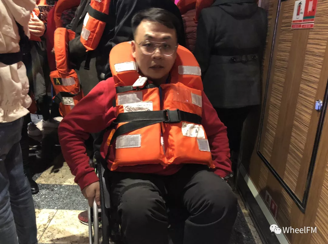 上船第一件事兒是先拍照,綠色背景,一位外籍船員舉著救生圈,和他拍照,后來(lái)才知道,照像免費(fèi),你要想拿到這個(gè)照片是需要付費(fèi)的。上船收拾好以后,一個(gè)最重要的活動(dòng)就是救生演習(xí),要求全體乘客都要參加,每個(gè)房間的衣柜里都有救生衣,大家要穿著救生衣到指定地點(diǎn)集合進(jìn)行救生演習(xí)。壯觀(guān)的是,船方會(huì)把所有的輪椅使用者都集中在一起,一排坐著輪椅的人穿上救生衣,真的很難得……