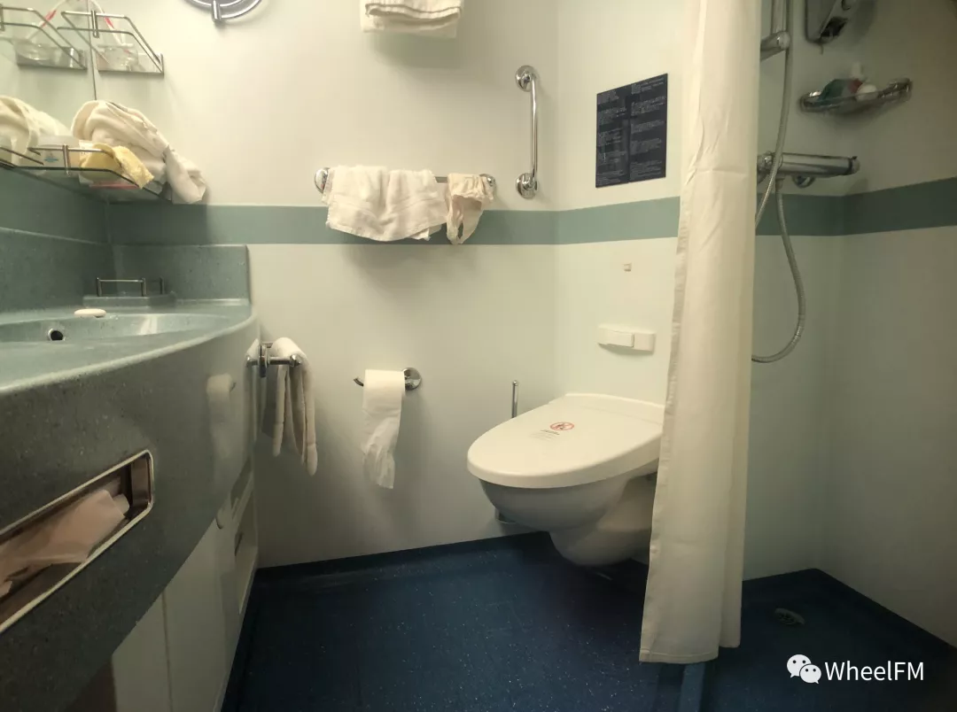 整個(gè)無(wú)障礙房間的門(mén)都比普通房間的門(mén)要寬很多,所有設(shè)施都是低位的,比如低位的開(kāi)關(guān),呼叫裝置等,就是床有點(diǎn)窄,有點(diǎn)高,具體高度因?yàn)闆](méi)帶尺子,所以沒(méi)有量,反正是挺高的。無(wú)障礙衛(wèi)生間也很大,三臺(tái)輪椅在里邊都轉(zhuǎn)的開(kāi),因?yàn)槭且獯罄O(shè)計(jì)的船,他們的無(wú)障礙不標(biāo)準(zhǔn)可能和我們不太一樣,馬桶兩側(cè)沒(méi)有扶手,但是他的浴凳很好,很結(jié)實(shí),也很軟,屁股肉少的小伙伴坐上去也沒(méi)什么問(wèn)題。然后洗手臺(tái)比較高,容膝空間不夠,對(duì)于我們來(lái)說(shuō)只能湊合用。船上的普通內(nèi)倉(cāng)房