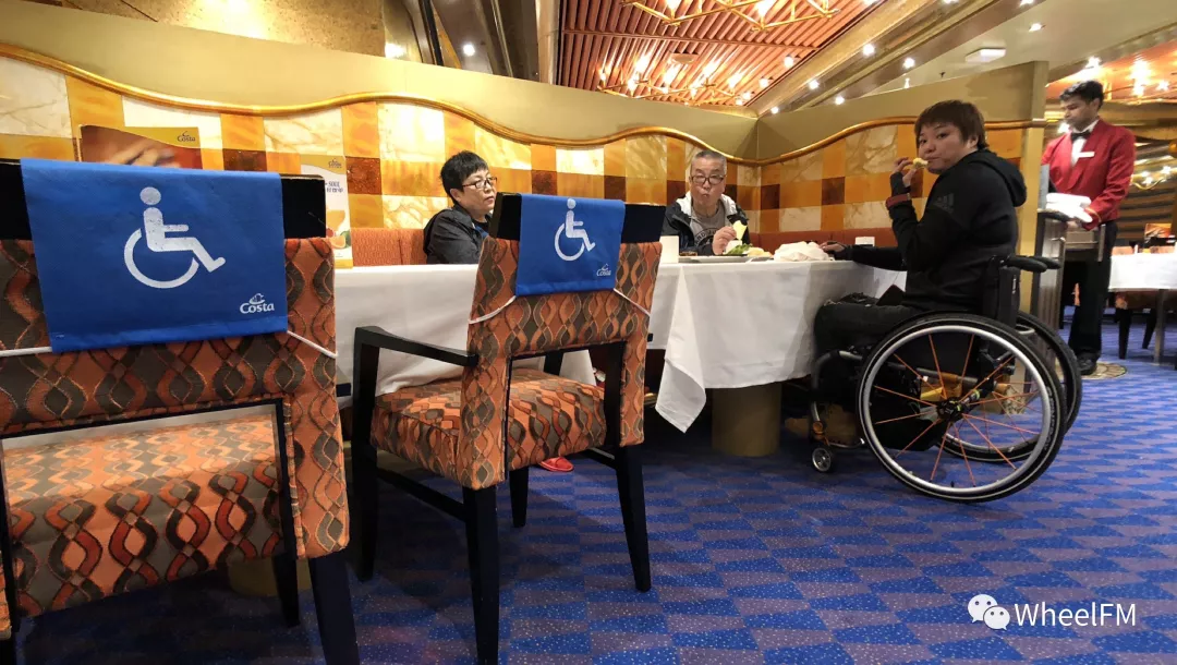如果去吃飯晚了,有的餐廳的無(wú)障礙坐席還是會(huì)被人占,我們就被抬到了有臺(tái)階的區(qū)域,不過(guò)工作人員還是抬的很專(zhuān)業(yè),同時(shí)被三位來(lái)自不同國(guó)家的帥哥抬,估計(jì)也就是在游輪上了。
