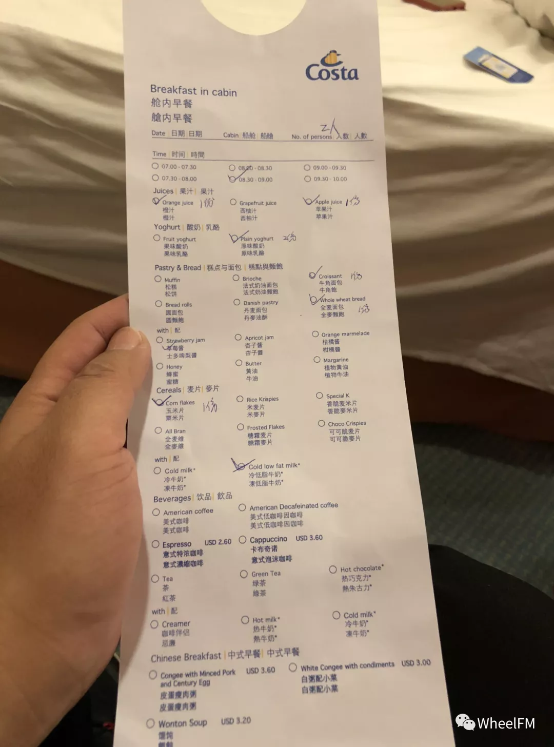 特別一提的是,船上的早餐是可以送到房間的,只要在晚上睡覺(jué)前,把點(diǎn)餐單掛到門(mén)口的把手上,第二天一早你醒來(lái)時(shí),就有豐盛的早餐啦,這個(gè)感覺(jué)真好……