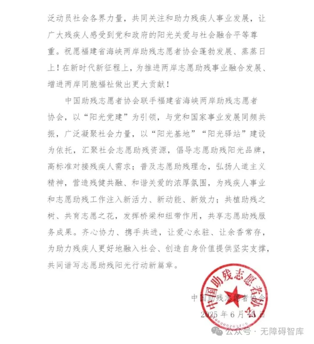 中國助殘志愿者協(xié)會(huì)聯(lián)手福建省海峽兩岸助殘志愿者協(xié)會(huì),以“陽光黨建”為引領(lǐng),與黨和國家事業(yè)發(fā)展同頻共振,廣泛凝聚社會(huì)力量,以“陽光基地”“陽光驛站”建設(shè)為依托,匯聚社會(huì)志愿助殘資源,倡導(dǎo)志愿助殘陽光品牌,高標(biāo)準(zhǔn)對(duì)接殘疾人需求;普及志愿助殘理念,弘揚(yáng)人道主義精神,營造殘健共融、和諧關(guān)愛的濃厚氛圍,為殘疾人事業(yè)和志愿助殘工作注入新活力、新動(dòng)能、新效力;共植助殘之樹、共育志愿之花,發(fā)揮橋梁和紐帶作用,共享志愿助殘服務(wù)成果。齊心協(xié)力、攜手共進(jìn),讓愛心永駐、讓余香常存,為助力殘疾人更好地融入社會(huì)、創(chuàng)造自身價(jià)值提供堅(jiān)實(shí)支撐,共同譜寫志愿助殘陽光行動(dòng)新篇章。