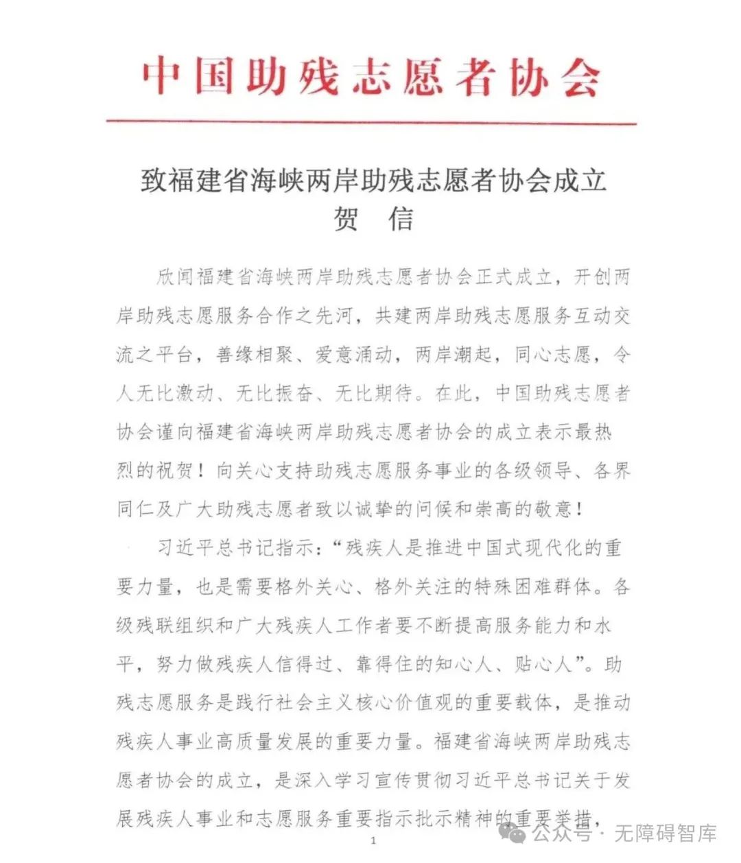 欣聞福建省海峽兩岸助殘志愿者協(xié)會(huì)正式成立,開創(chuàng)兩岸助殘志愿服務(wù)合作之先河,共建兩岸助殘志愿服務(wù)互動(dòng)交流之平臺(tái),善緣相聚、愛意涌動(dòng),兩岸潮起,同心志愿,令人無比激動(dòng)、無比振奮、無比期待。在此,中國助殘志愿者協(xié)會(huì)謹(jǐn)向福建省海峽兩岸助殘志愿者協(xié)會(huì)的成立表示最熱烈的祝賀!向關(guān)心支持助殘志愿服務(wù)事業(yè)的各級(jí)領(lǐng)導(dǎo)、各界同仁及廣大助殘志愿者致以誠摯的問候和崇高的敬意!