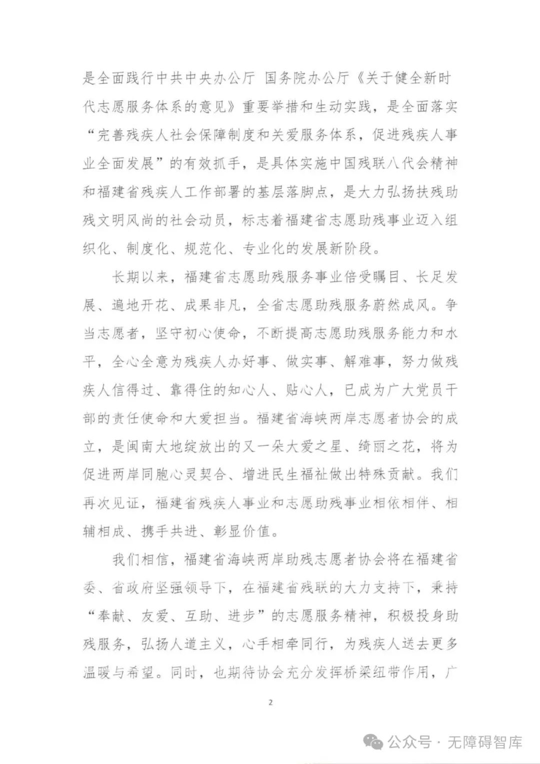 我們相信,福建省海峽兩岸助殘志愿者協(xié)會(huì)將在福建省委、省政府堅(jiān)強(qiáng)領(lǐng)導(dǎo)下,在福建省殘聯(lián)的大力支持下,秉持“奉獻(xiàn)、友愛、互助、進(jìn)步”的志愿服務(wù)精神,積極投身助殘服務(wù),弘揚(yáng)人道主義,心手相牽同行,為殘疾人送去更多溫暖與希望。同時(shí),也期待協(xié)會(huì)充分發(fā)揮橋梁紐帶作用,廣泛動(dòng)員社會(huì)各界力量,共同關(guān)注和助力殘疾人事業(yè)發(fā)展,讓廣大殘疾人感受到黨和政府的陽光關(guān)愛與社會(huì)融合平等尊重。祝愿福建省海峽兩岸助殘志愿者協(xié)會(huì)蓬勃發(fā)展、蒸蒸日上!在新時(shí)代新征程上,為推進(jìn)兩岸志愿助殘事業(yè)融合發(fā)展、增進(jìn)兩岸同胞福祉做出更大貢獻(xiàn)!