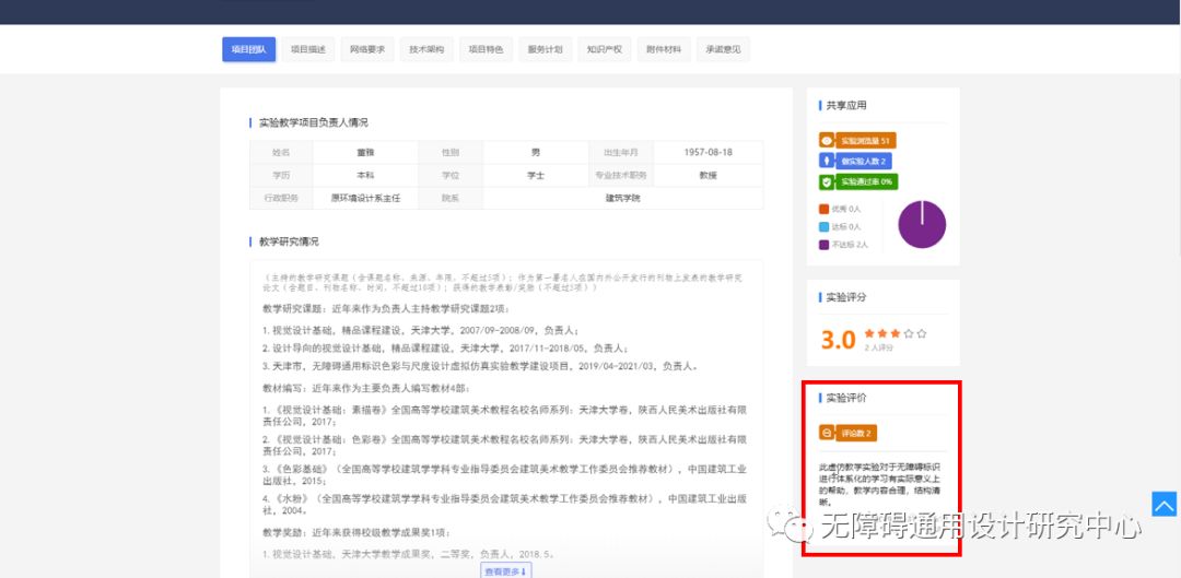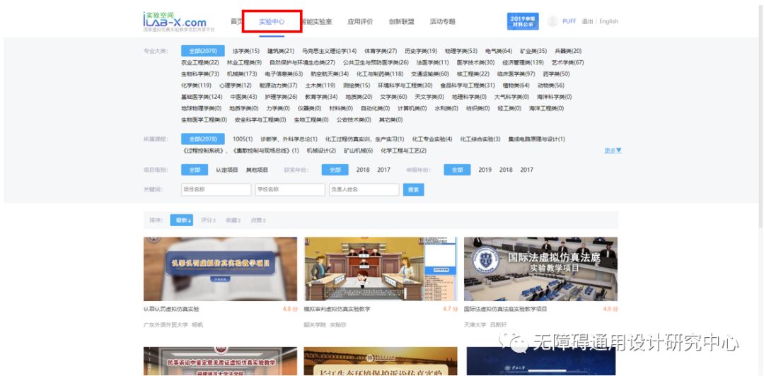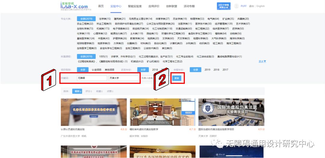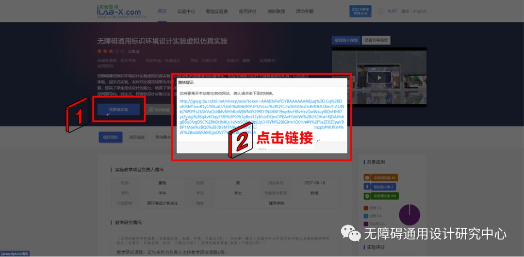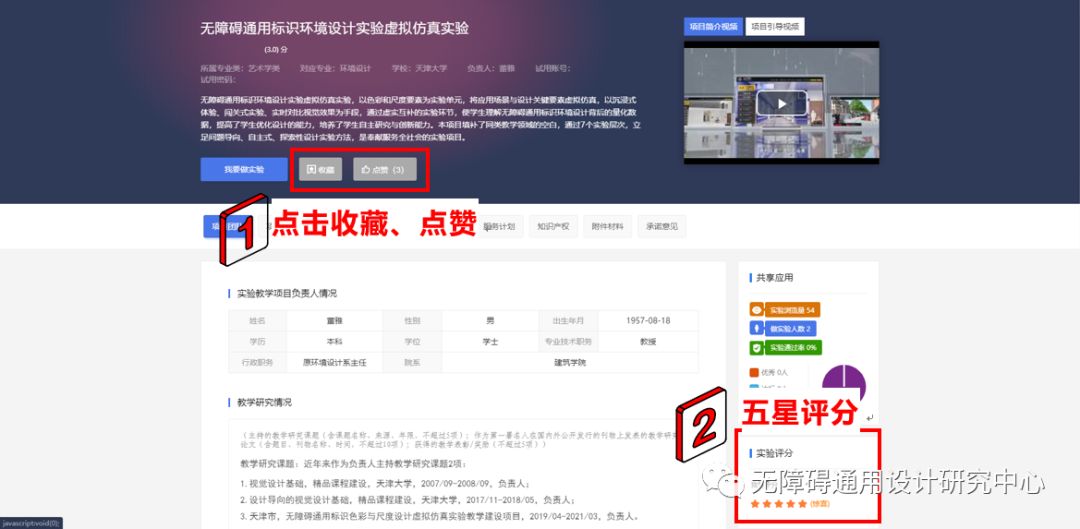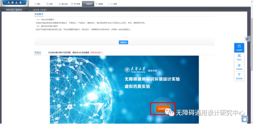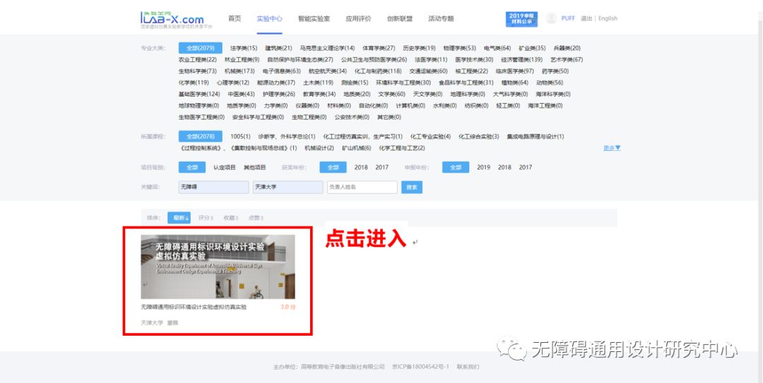查找到本項目“無障礙通用標識環(huán)境設計實驗虛擬仿真實驗”。點擊該實驗進入項目詳情。