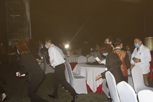 上午10時30分疏散逃生演練正式開始,尖銳的警報聲打破了蘭晶劇場的寧靜,滾滾濃煙彌漫劇場。根據(jù)演習(xí)總指揮的命令,消防疏散引導(dǎo)員立刻帶領(lǐng)員工們掩住口鼻,迅速有序地從劇場逃生疏散出口撤離到外面空地。緊接著,滅火搶救組快速趕到現(xiàn)場,控制火勢、驅(qū)散濃煙,安全救護組做好現(xiàn)場傷員的緊急救護工作,整個疏散、滅火過程用時五分鐘。