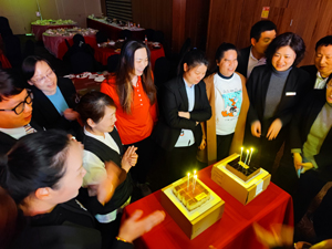 2月28日下午公司一樓牡丹廳布置一新,正面大屏幕上,我與公司共成長的字眼格外醒目,五張鋪就整潔的大圓桌上,繽紛的賀卡、亮眼的蛋糕、精制的點(diǎn)心、琳瑯水果和醇香的咖啡,營造出怡人暖心的氣氛……這是公司工會(huì)首舉辦的員工集體生日活動(dòng)的現(xiàn)場(chǎng)場(chǎng)面。