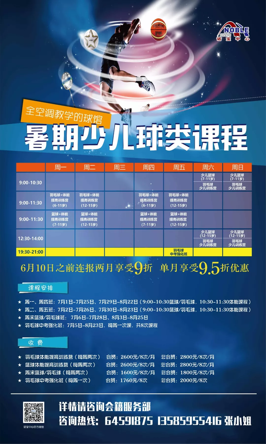 羽毛球+體能提高訓(xùn)練營(yíng) 籃球+體能提高訓(xùn)練營(yíng) 周一、周四班 7月1日-7月25日、7月29日-8月22日 周二、周五班 7月2日-7月26日、7月30日-8月23日 周末籃球班/羽毛球班 7月6日-7月28日、8月3日-8月25日 羽毛球中考強(qiáng)化班 7月5日-8月23日,每周一次課,共8次課程