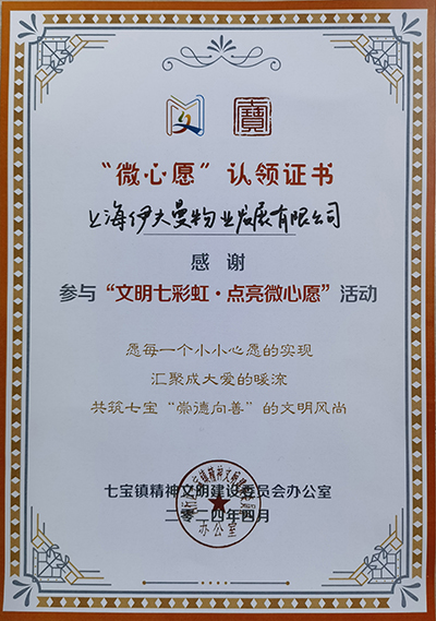 4月2日,公司獲得閔行區(qū)七寶鎮(zhèn)精神文明辦公室頒發(fā)的“微心愿”認領(lǐng)證書,這是公司參與七寶鎮(zhèn)“文明七彩虹 點亮微心愿”活動,幫助困難群眾解決“微需求”的具體行動,也是公司履行上海市文明單位義務(wù),為社區(qū)精神文明建設(shè)添磚加瓦的生動體現(xiàn)。