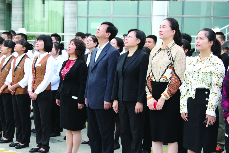 參加升旗儀式的全體人員整齊列隊(duì),莊嚴(yán)肅立在旗桿臺(tái)對(duì)面。上午10時(shí)整,升旗儀式準(zhǔn)時(shí)開(kāi)始。隨著儀式指揮員一聲令下,中心安保部3名隊(duì)員護(hù)衛(wèi)著國(guó)旗,踏著威武雄壯的步伐走向旗桿臺(tái)。當(dāng)旗手抵達(dá)升旗臺(tái)后,莊嚴(yán)的國(guó)歌響起,升旗手揮動(dòng)手臂劃出優(yōu)美弧線,鮮艷的五星紅旗迎風(fēng)展開(kāi),冉冉升起。廣場(chǎng)上參加儀式的全體員工滿懷崇敬之情向國(guó)旗行注目禮,送上對(duì)祖國(guó)最美好的祝福。