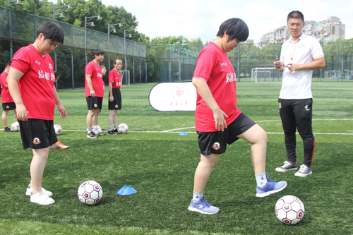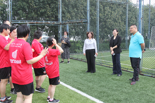 上午九點,聯(lián)誼活動正式開始。諾寶中心綠蔭場上陽光明媚,生機勃勃。中心合作單位愛和恩俱樂部的足球教練帶領陽光之家學員們一起進行足球康復訓練,足球教練為學員們示范了足球基本步法等知識,組織學員們開展射門和分組對抗游戲,學員們隨著教練的口令和步伐,在球場上奔跑戲謔,充滿了歡聲笑語。