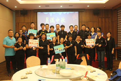 大家欣賞著自己親手制作的月餅,節(jié)日的喜悅之情溢于言表,學員們更是興奮不已,拿著自己做好的月餅和中心志愿者合影留念,還把月餅放到一個個小包裝盒內,準備帶回去跟家人一起分享。