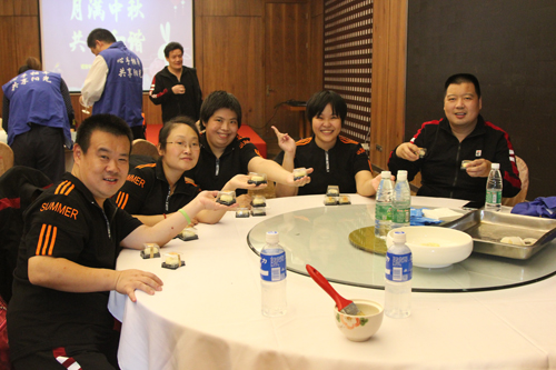 接下來的互動環(huán)節(jié)中心志愿者與學員們共同制作冰皮月餅。制作材料端上桌后,大家都摩拳擦掌、躍躍欲試。主持人先為大家簡單講解了一下制作過程,中心志愿者將月餅皮和紅豆、蓮蓉等餡料先分成一份份的,然后帶著學員們揉餅皮,包餡料,壓模子,大家分工配合,密切協(xié)作,有條不紊地進行制作,不一會兒,印著中秋字樣的冰皮月餅就呈現(xiàn)在大家面前。