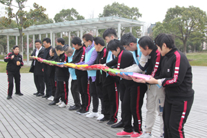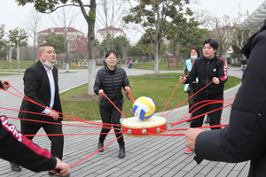 志愿者和學(xué)員們一起開展了“同舟共濟齊擊鼓”、“珠行萬里”團隊項目?!巴酃矟R擊鼓”,要求參與者每人牽拉一根鼓上的繩子,將一個排球放在鼓面上,同心協(xié)力,創(chuàng)造盡可能多的顛球記錄。志愿者和學(xué)員們躍躍欲試,隨著開始口令,大家一起拉繩,有節(jié)奏地把球在鼓面上連續(xù)地顛起。一開始,大家只能連續(xù)顛一兩下,在不斷的磨合中,學(xué)員們慢慢找到了竅門,最多能連續(xù)顛十幾下,讓大家感受到了團隊的力量。“珠行萬里”的游戲需要大家用管道將球快速滾到杯子里。中心志愿者和學(xué)員們分成了兩隊開展比賽,看誰最先讓球滾入杯子。經(jīng)過三局兩勝的較量,最終學(xué)員隊獲得了勝利。