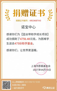 捐款活動(dòng)開(kāi)展以來(lái),中心員工們用“愛(ài)心”匯聚力量,用“慈善”傳遞溫暖,共計(jì)為藍(lán)絲帶助學(xué)成長(zhǎng)項(xiàng)目捐款14756.48元,其中以單位名義捐款10000元,以員工個(gè)人名義募捐4756.48元,捐款員工達(dá)到306人次。