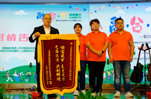 2019年10月,上海諾寶中心與上海黃浦區(qū)美愛(ài)融合藝術(shù)公益發(fā)展中心合建諾寶美愛(ài)藝術(shù)團(tuán),并連續(xù)5年為他們免費(fèi)提供固定排練場(chǎng)地。活動(dòng)現(xiàn)場(chǎng),為感謝上海諾寶中心長(zhǎng)期以來(lái)對(duì)諾寶美愛(ài)公益事業(yè)的支持和幫助,主辦單位向上海諾寶中心頒贈(zèng)了致謝錦旗。上海諾寶中心董事長(zhǎng)張京津在接受錦旗時(shí)表示:上海諾寶作為中國(guó)殘疾人體育藝術(shù)培訓(xùn)基地,很愿意成為廣大殘障伙伴的家,歡迎殘障伙伴“?;丶铱纯础?。